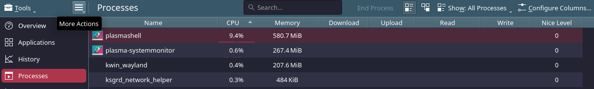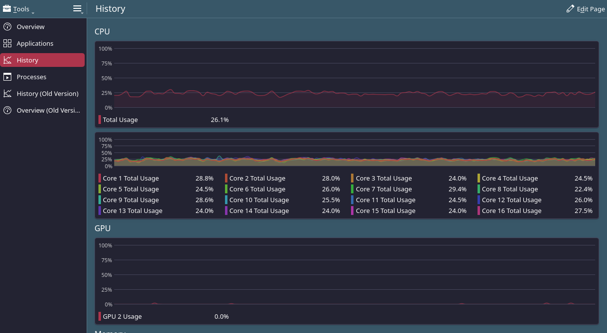 Thank you, and I would agree as I dont really care about as long it as its running, but many other things are broken atm. My cpu is idling at 10%, all of which is plasmashell, and if i change it to my animated wallpaper it jumps to 40%. Even at 10%, that would mean i have almost 2 cpu cores completely saturated at 100% continuously. Here is a screenshot while im running ksysgaurd (i know ksysgaurd is basically abandoned.) It’s using a whopping ~25% of all cores drawing this graph and you can also see that the GPU section is essentially blank, though from time to time it has very large (90%) spikes. (Edit: my bad, you -cannot- see the GPU spikes, as i missed them in this screenshots, just trust me they do happen lol———–I just noticed and am more concerned about the fact that it says GPU “2” as I have a single pic-e card and no onbaord graphics at all)