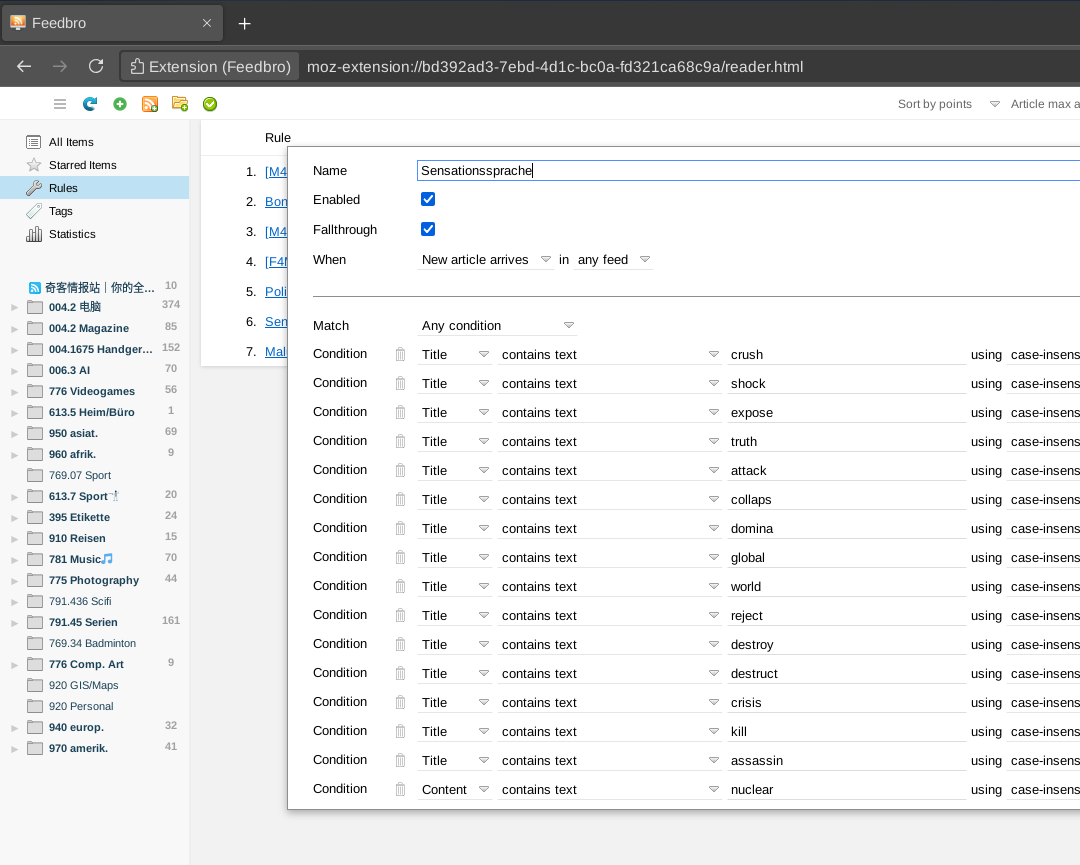 EDIT: And in terms of RSS news feeds, I’m a subscriber to about 300 channels, blogs, sites and what not, and that allows them, the newsrooms and writers, to shovel a lot of content to my screen, I’m using word “rules” to filter those articles and videos, it’s possible to delete new posts outright, or to assign negative points that push the articles to the end of the stack, positive points for raising the articles to the top, often it’s the best choice not to subscribe at all. I think headlines like, “I was shocked by this, what happens next?”, are clickbaits and not worthwhile. I have many political names, country names (pairs of enemies), ideological words in the “rules”, and buzzwords like “AI”.