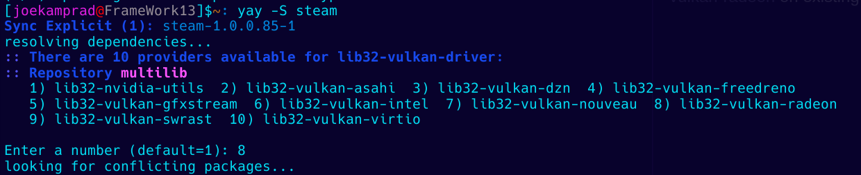 By that means, AMD GPU user running steam per example should replace lib32-amdvlk with lib32-vulkan-radeon on existing steam installs, lib32-amdvlk is removed from Archlinux repo now.
