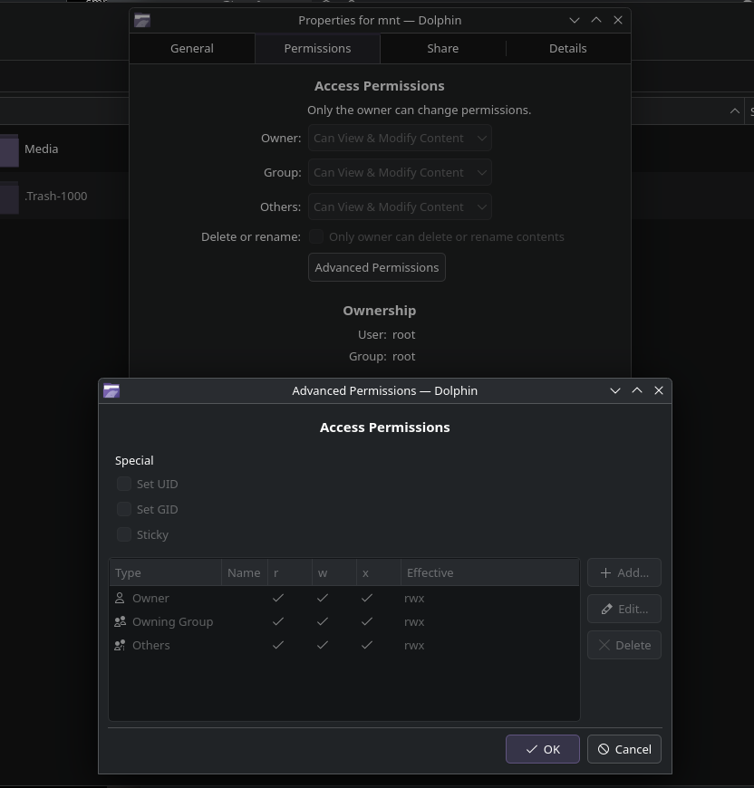 and here is the drive permissions and then the folder on the drive that contains all my media files