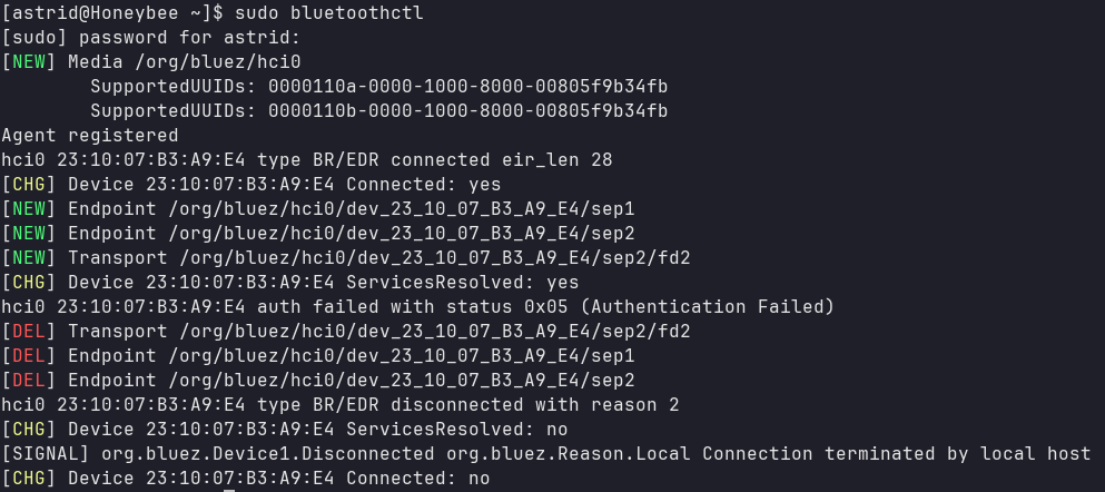 Restarting bluetoothctl, unpairing and pairing, reloading the btusb module and rebooting the laptop don’t work.
