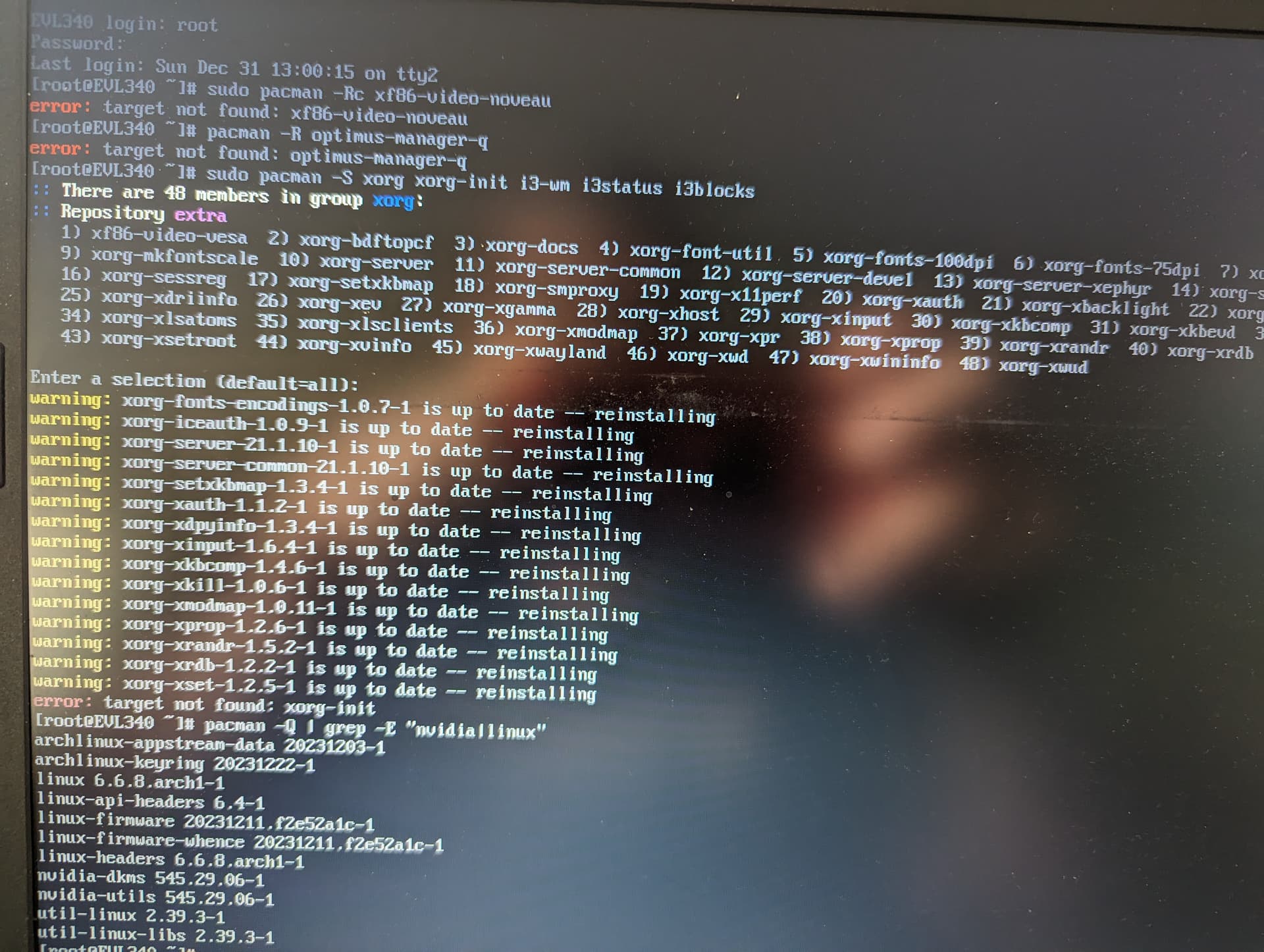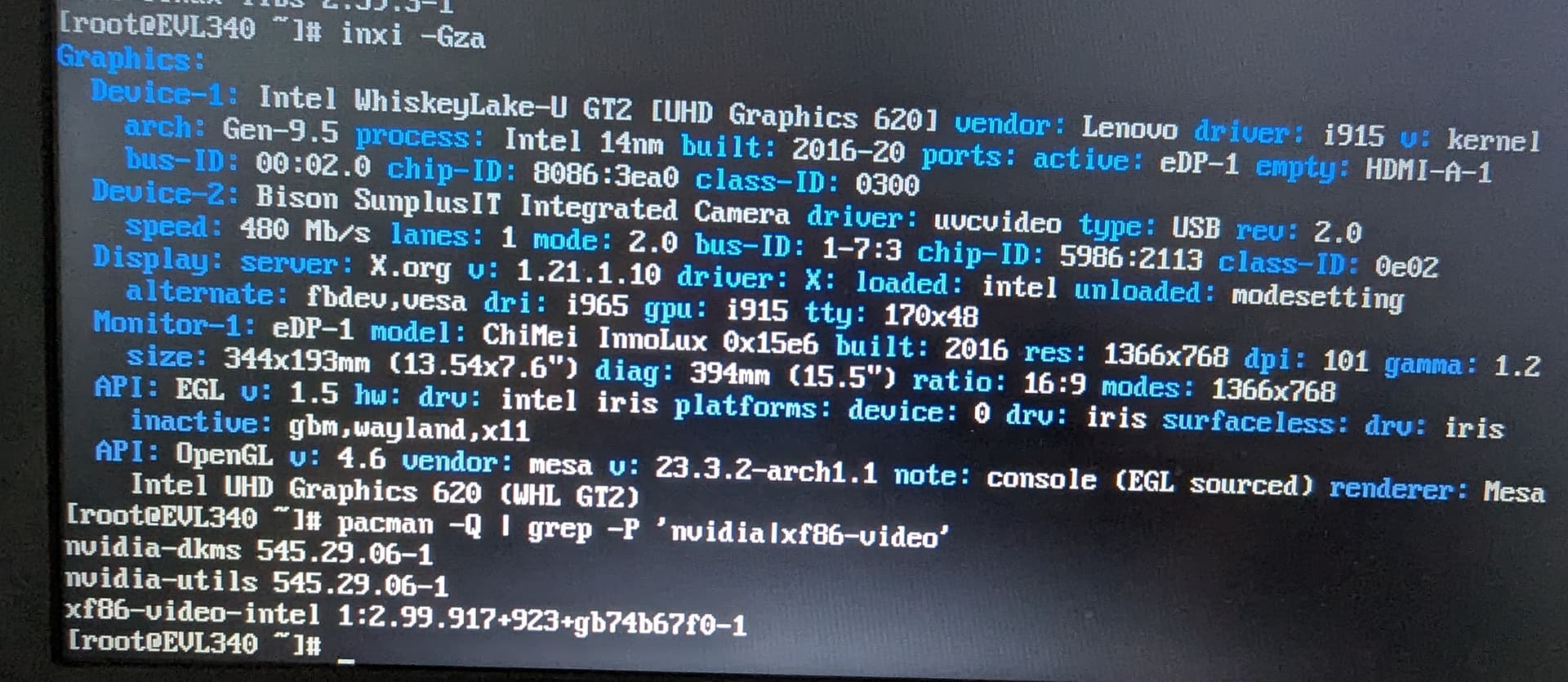 This is on Lenovo L340 with integrated graphic cards. NO external Nvidia! But I did install some Nvidia drivers for the hell of it following a tread from the forum. Also I synced pacman and downgraded Linux headers without result.