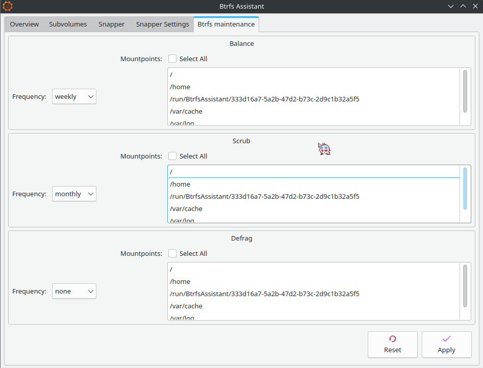 I’m not an expert on btrfs or btrfs-assistant or snapper or grub but my installs are the same. My installation on EOS is btrfs with swap file using grub and after i adjusted the swap file to make it larger as the default on the install is small. I install btrfs-assistant, snapper-support and btrfsmaintenance. It pulls in some other packages. I’m very very happy with it’s overall function, features and performance as well as it’s stability. Btrfs is awesome and with snapper it gives me a lot of flexibility. It is also very easy to arch-chroot if necesarry and i have also added a hook for grub so that it re-installs and updates grub on updates to kernels. Couldn’t be better. As far as btrfs is concerned it is extremely stable and i have zero issues with corruption.