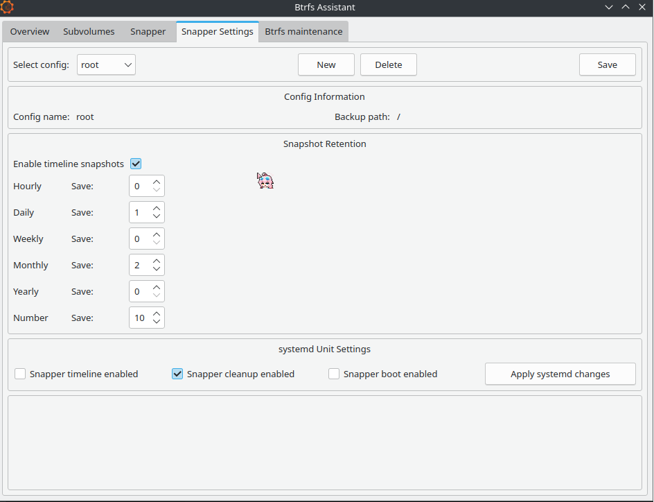 so im new to snapper since back when i used nobara, i just opted for timeshift and i wanted to try snapper out. i looked through some forum posts and found a few that suggested snapper. so i installed snapper, btrfs-assistant, snapper-support, snap-pac, btrfsmaintenance.