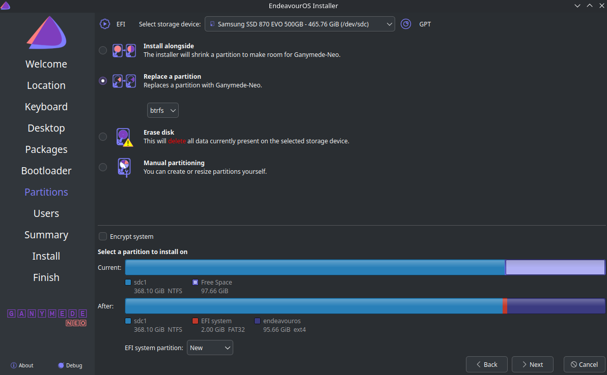 Same thing happen, you can select btrfs but it stays on ext in the view and installes ext4 instead the same. .. same also in case you use any setup its related to “replace partition” and slecting empty space.