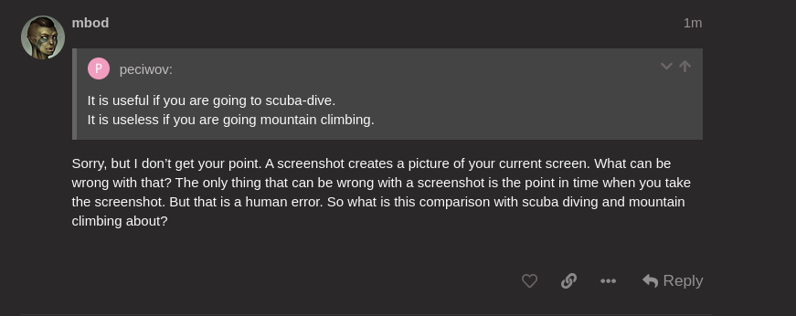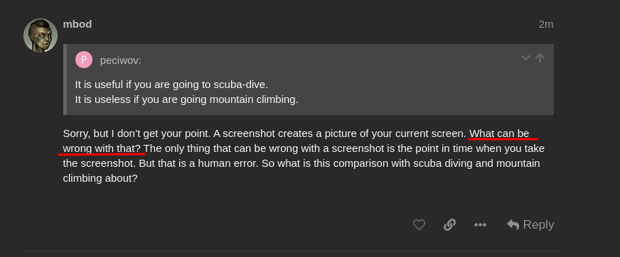 Sorry, but I don’t get your point. A screenshot creates a picture of your current screen. What can be wrong with that? The only thing that can be wrong with a screenshot is the point in time when you take the screenshot. But that is a human error. So what is this comparison with scuba diving and mountain climbing about?