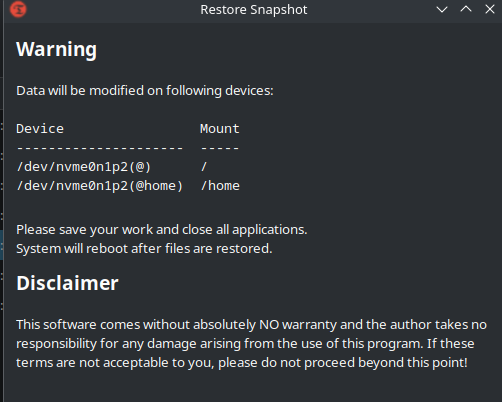 Hello, this is just a post to help maybe resolve or get info on a couple of issues I’ve run into when doing a timeshift btrfs snapshot restore test.