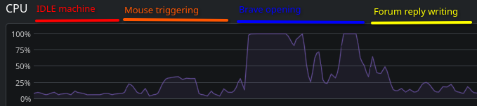 In the graphic down here, you can see the CPU during some normal operations: in the first part, the computer was IDLE, nothing opened, nothing running in background but the task manager itself. The first peak was the moment when I started moving the mouse around, simply pointing everywhere. Then, when I commanded the opening of Brave, you can see the CPU jumped 100% for some seconds, which is very annoying because it freezes the computer for some time. While I’m typing these lines, it stays calm at 20%.