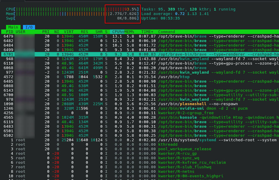 I installed the package for Nvidia legacy drivers (nvidia-580xx-utils), as the graphic card (Nvidia GTX 1060 3GB) was not working with the latest ones, and everything seemed to work properly (at least from the GPU’s perspective). Eventually, during normal tasks (like watching a YouTube video on Brave), it happened to have some lags, disconnecting Bluetooth headphones, freezing video, and generally being less responsive than it should have been. 8GB DDR4 RAM wasn’t overcharged, so I started checking the CPU (Intel i5-9400F), and I noticed that it jumped regularly at 100% usage. When this happens, the computer obviously slows down. This doesn’t only happen when I’m actively using Brave, but also when I’m playing a non-expensive game, making it freeze for half-a-second. It’s becoming frustrating, because I bought that used PC mostly to play games with, and generally I would like a computer with these decent specifications to be at least fluid.