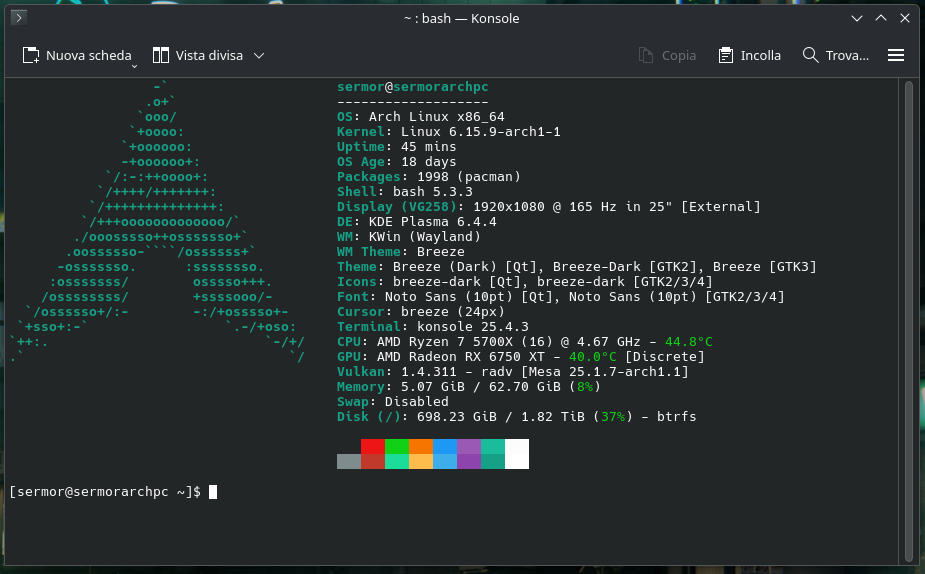 Host: sermorarchpc Kernel: 6.15.9-arch1-1 arch: x86_64 bits: 64