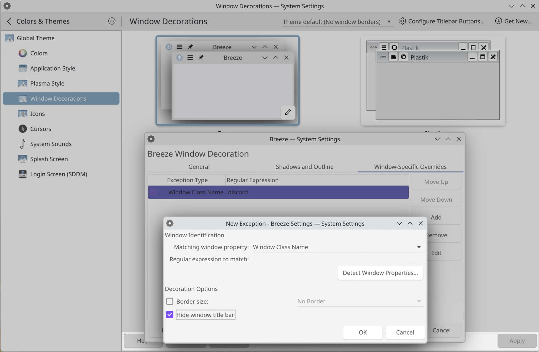 and then click on Discord window. Check the Hide window titlebar checkbox. Click OK and then on Apply.