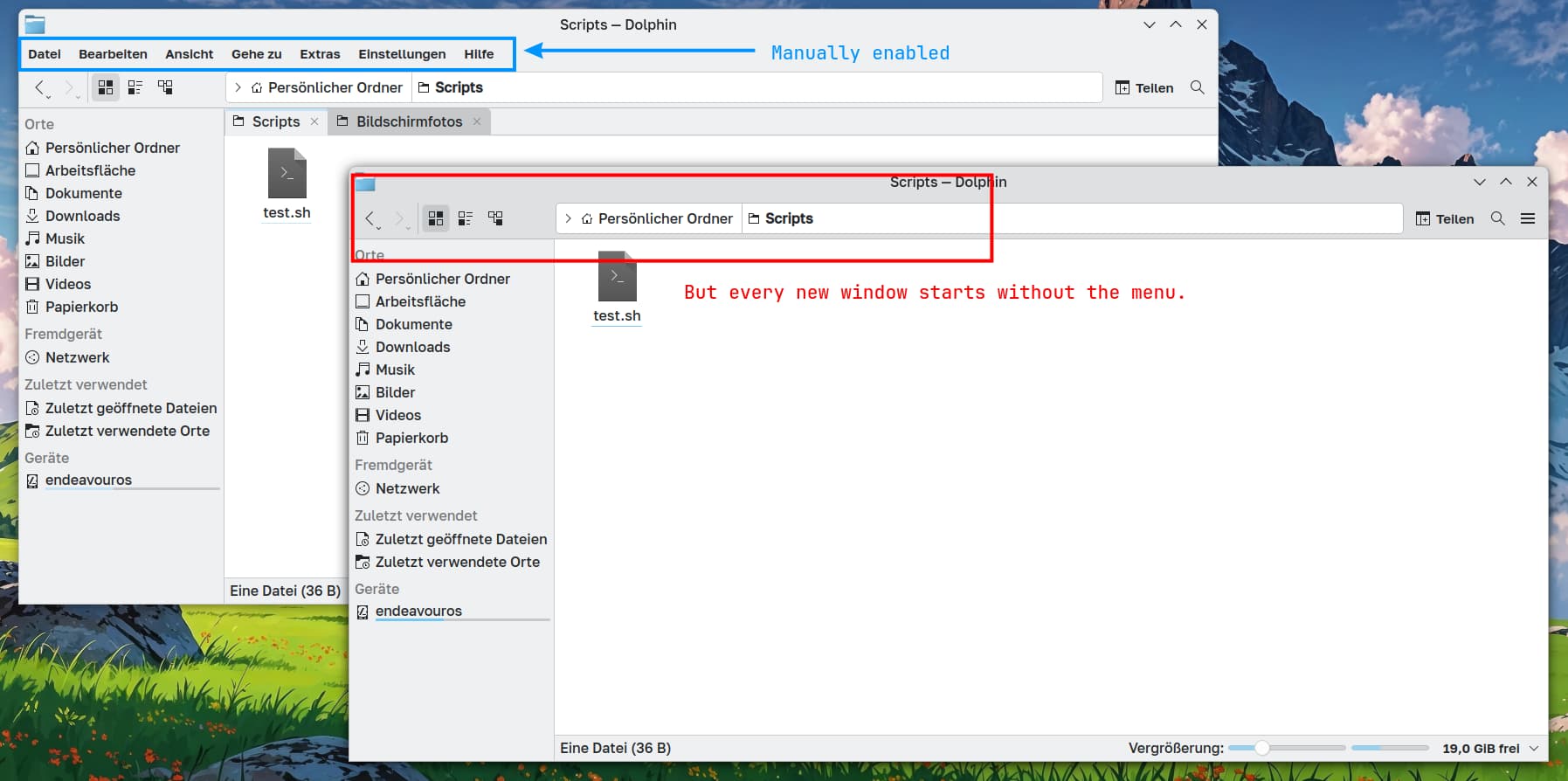 Why not in EndeavourOS? Where can I enable it? I can’t find how to enable the menu permanently. Ctrl + M or enabling through the hamburger menu, enables it only temporary.