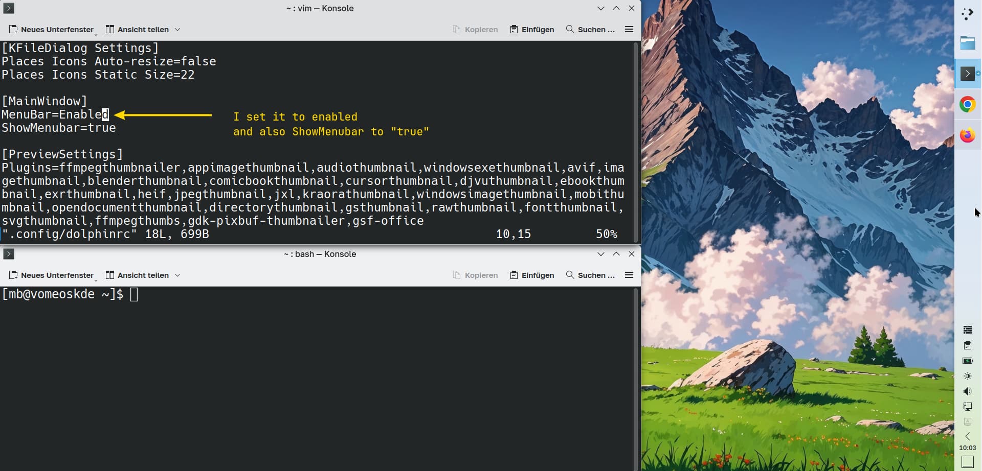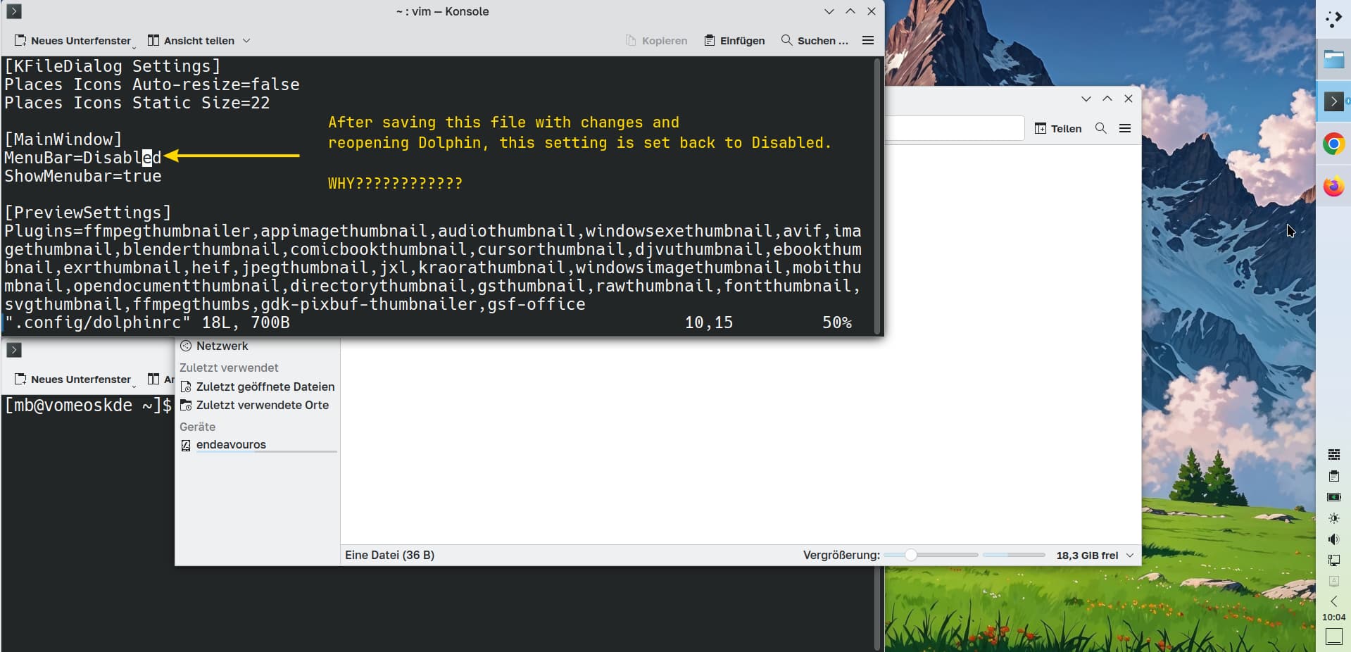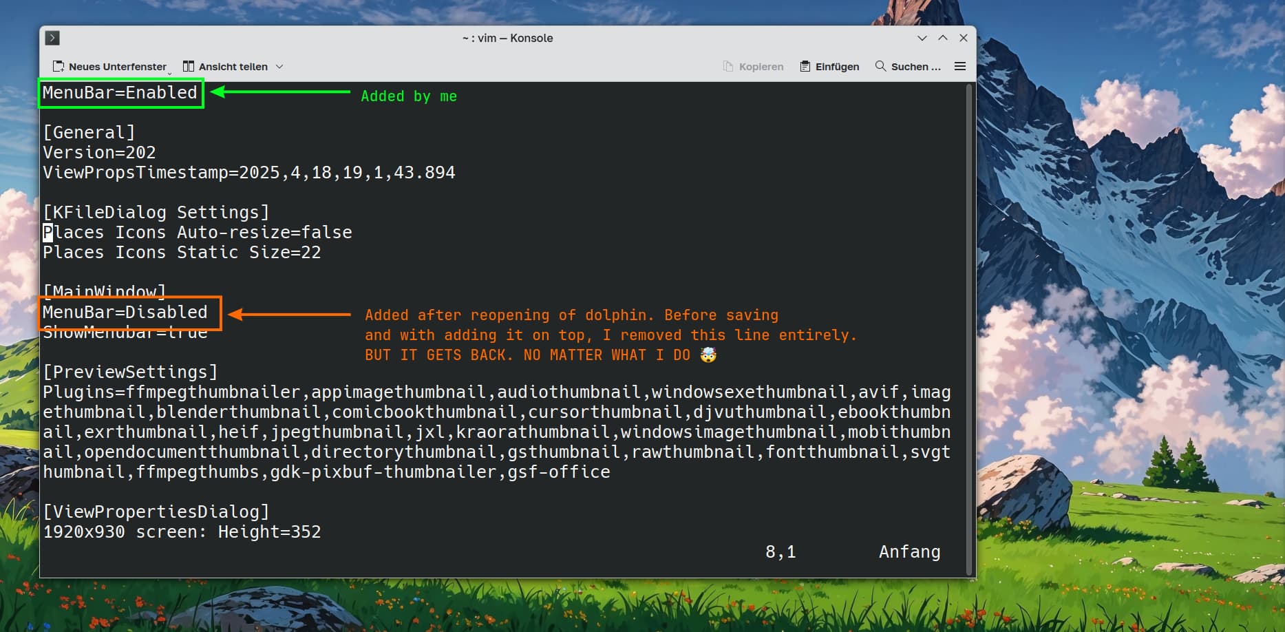 I took a look into ./config/dolphinrc. There is an option MenuBar=Disabled. If I change this to Enabled (while dolphin is closed), save this file and open new dolphin window, menu isn’t there and the setting is overriden! Why? What the heck does override it?