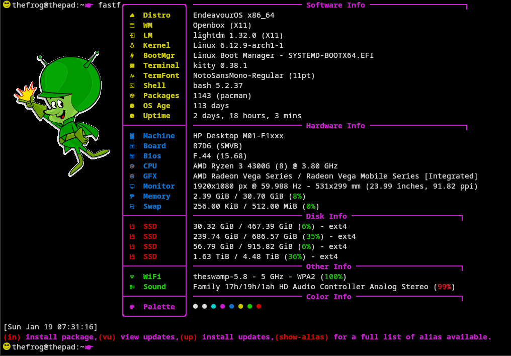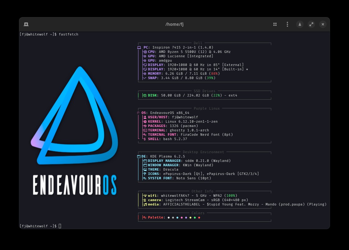 i edited your guys fastfetch config file and combined them as well to make my own thing. thanks guys for your hard work you put into making the config file because i am essentially illiterate when it comes to coding. i managed to figure things out though based on what you guys did. without you guys i wouldn’t have such a cool pimped out fast fetch config file. anyway here is what i created based on your guys stuff.