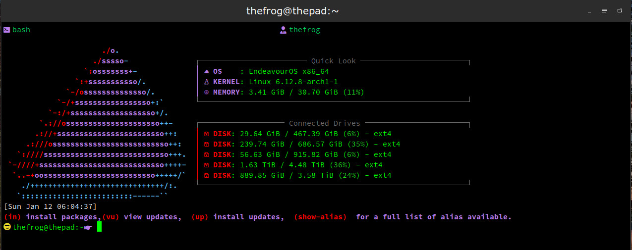 That is the beauty of Linux everyone can setup things the way they think is best for them. I actually did this because I went trough my bashrc file and did some cleaning up. Thought I would give bash as new look for when I open it. The only actual part of the “prompt” is from the date down. The first is just a splash type screen for when I open my alacritty.