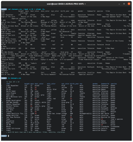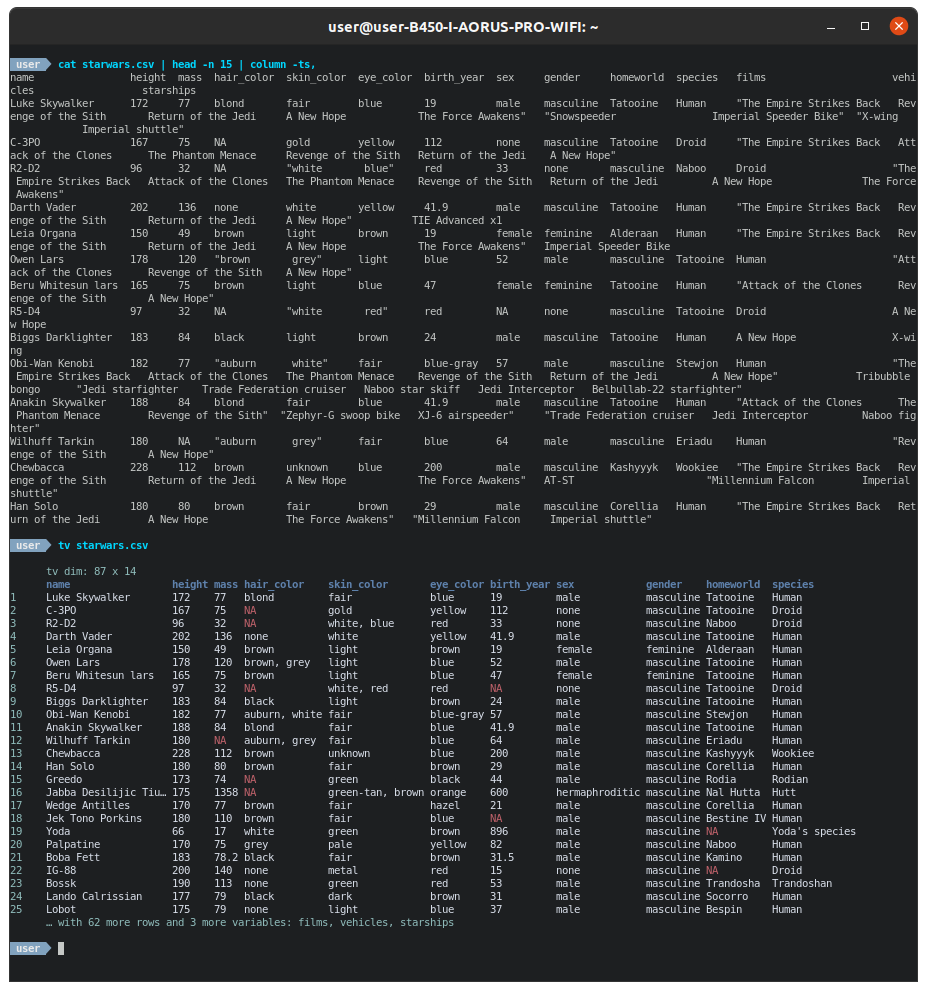 I tried using this tidy-viewer⦠Itās very raw and unpolished. It would be nice to be able to scroll vertically and horizontally through a several gigabytes long CSV file, but you canāt even pipe the output to less.