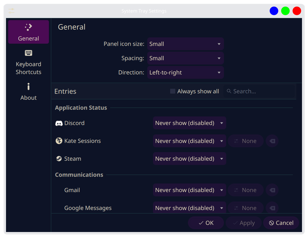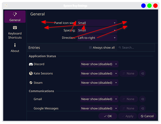 My goal was to consolidate the repeating “Panel icon” label in front of each setting. If you just right click on your tray and then click “Configure System Tray…” you will see exactly what I mean.