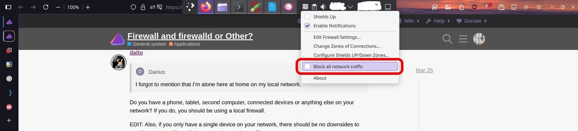 There is this option that I get when I use FirewallD and right click on the firewall icon. âBlock all network trafficâ It is circled in red in the image below. Will that work?