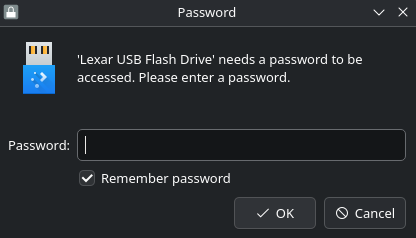The KDE Plasma password prompt was what might pop-up if you don’t set up the USB drive in /etc/crypttab and /etc/fstab at all.
