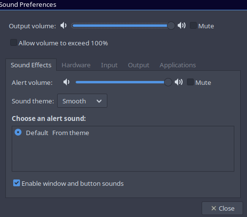 Like the title says, I would like to get a working sound theme. Currently it’s the cpu beep which makes me jump ever time lol. I have libcanberra installed as well as the Smooth theme from aur but I can’t seem to get anything working. I also enabled event sounds and input feedback sounds in gtk settings and even tried manually adding gtk-sound-theme-name=Smooth to ~/.config/gtk-3.0/settings.ini. I feel like there’s something fundamental that I’m missing here but I couldn’t find anything after a few hours of searching.
