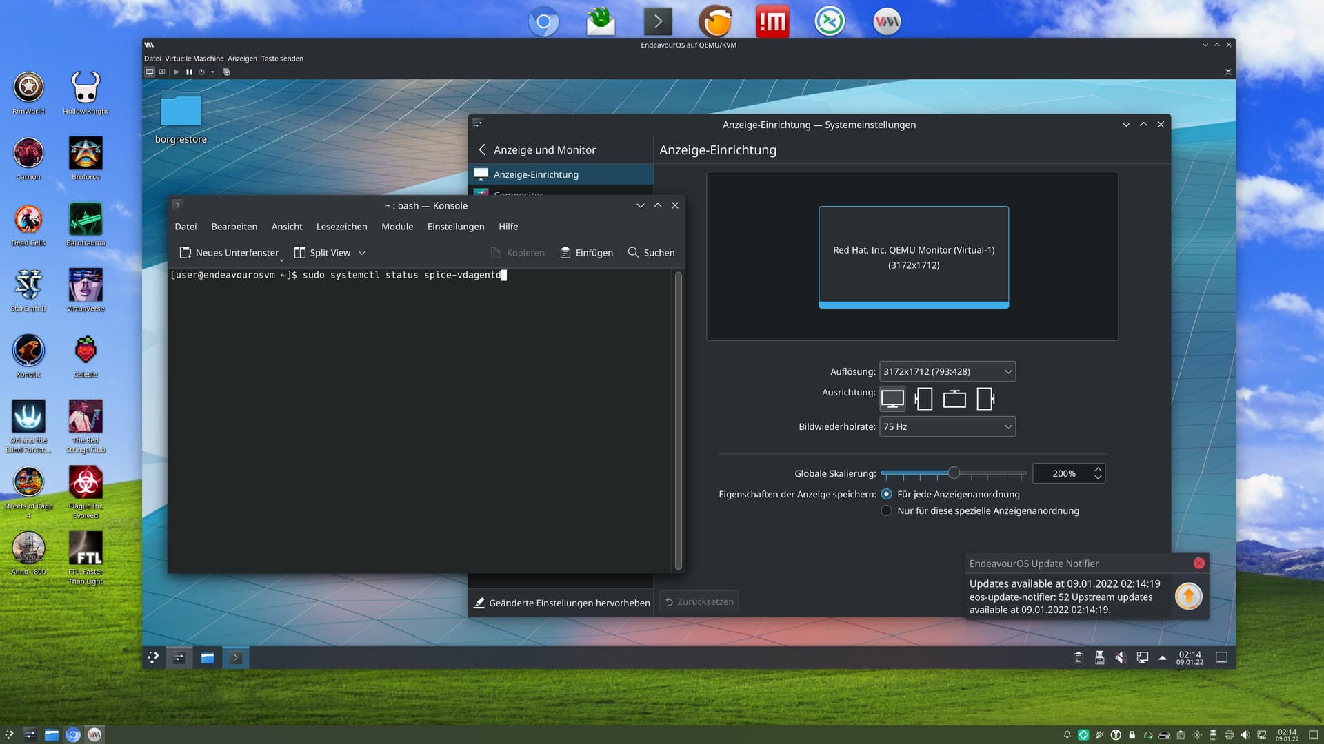 I don’t run vm in full screen. I just want it to fit in the window that is the vm window but fully? So on vbox it always works before i even install it. I boot on the live ISO and set it before the install to my screen resolution. Then it adjust slightly on the install because the vm window is slightly smaller than the screen resolution., I have never been able to do it on virtmanger no matter what i have tried or what other people tell me. The best i can get is 1440x900 or i get scrolling. My resolution on this particular monitor is 1680x1050. In v-box it self adjusts to fit 1680x931