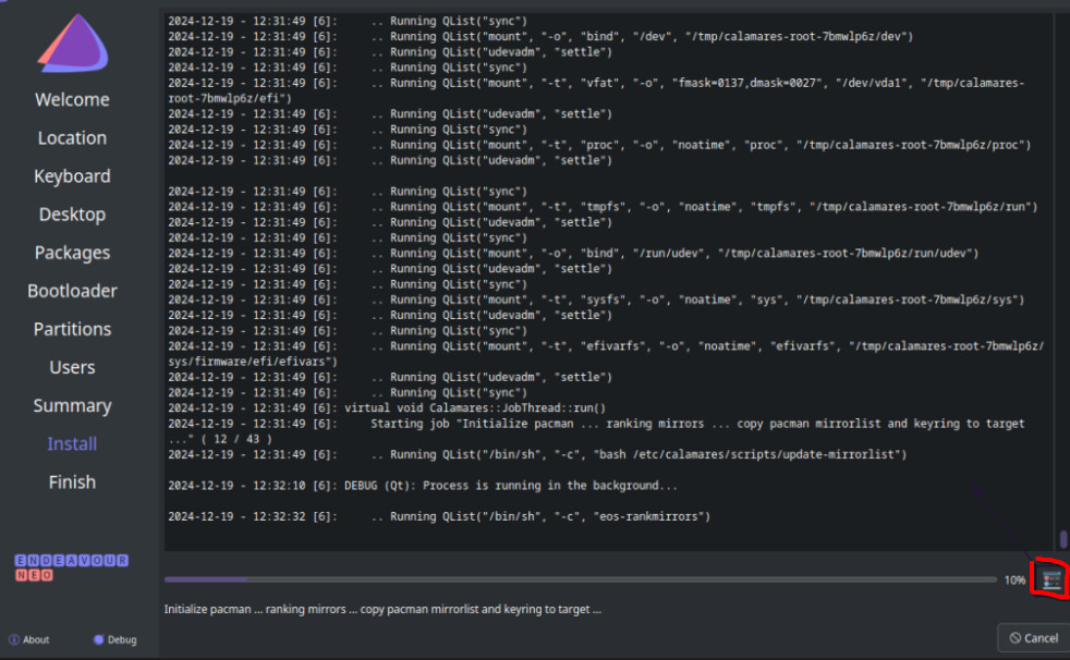 About the UI progress bar, there is none but clicking on the button on the bottom right would have shown you the progress. That is how Calamares works i believe because have seen that on almost every distro I have installed that uses Calamares.
