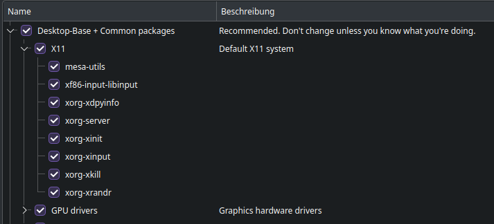 Just installed EOS from the new Ganymede Neo ISO with KDE Plasma Desktop. I wanted to have a pure Wayland system, so I decided to disable all Default X11 System packages in the Installer.