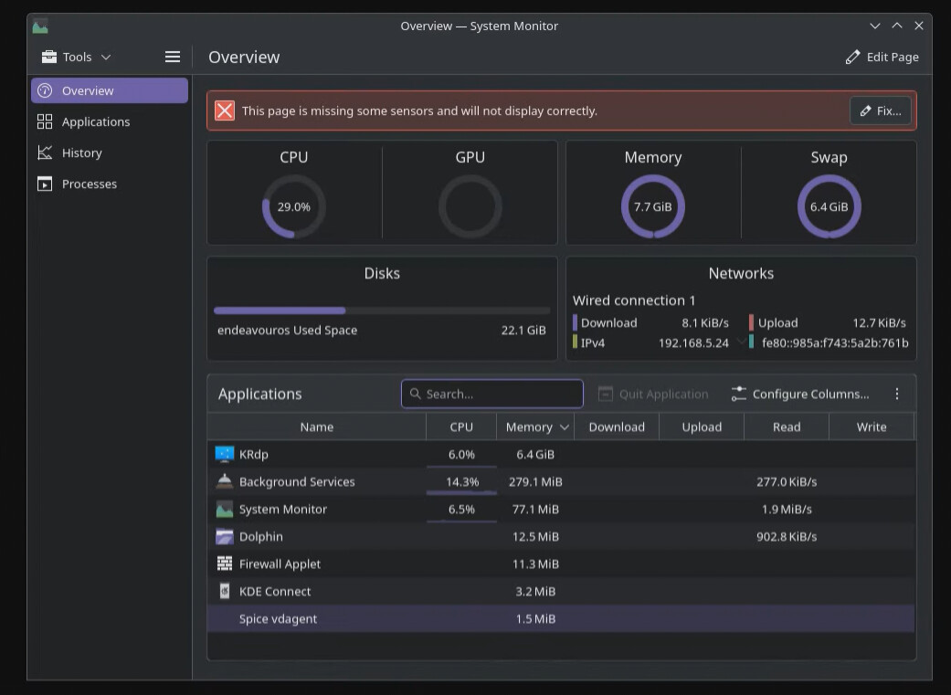 I was wondering if any of you has even encoutered this issue with Kde Plasma Wayland and KRDP on Endeavour. I have installed the KRDP service to connect to a VM which has EOS installed on it. It runs plasma as DE but for some reason as soon as I connect to the VM with Remmina or KDRC the memory usage of the service start to increase until the kernel kills the service. It take a couple of minutes for the service to fill the ram and the swap. It’s not a small memory leak it goes up fast enough to make it barely usable (2 -3 minutes to fill 8 gb of ram). I’ve taken a look at the Kde bug list for KRdp and don’t really see a OOM issue beside this one : https://bugs.kde.org/show_bug.cgi?id=507949 which is not exactly what I have. Before creating a bug report on KDE I wanted to see if this is fixable in any way or related to EOS. Disconnecting does not make the KRdp service memory return to normal. It stays at the current value until the service is resetted by the kernel or restarted by me.