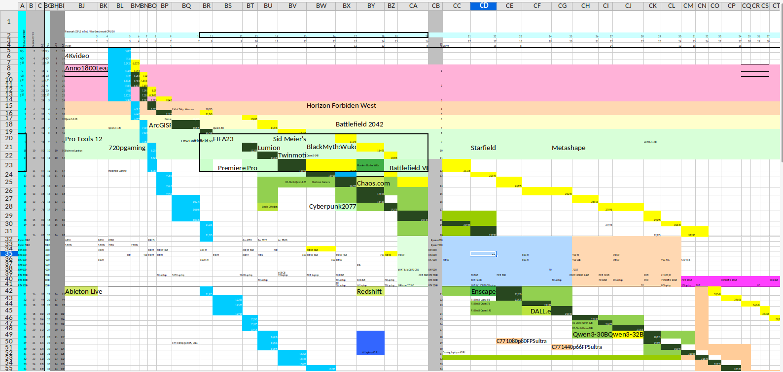 This is an Excel spreadsheet for, each cell is performance-level combination for CPUs and GPUs.