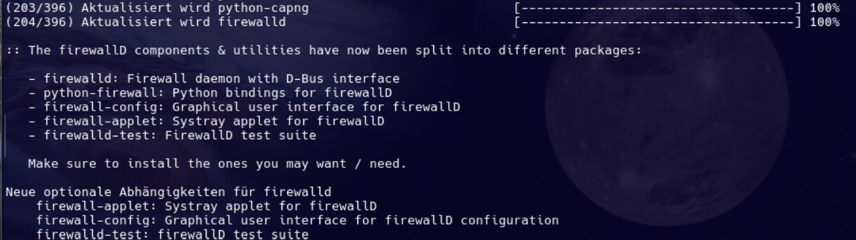 Firewalld packages are splitt now if you need the applet and config GUI tools just sudo pacman -Syu firewall-applet should bring the applet back, and it will bring in firewall-config as dependency, so the config GUI will be back in the same. If you do not install these, firewalld will still run but you will not have the applet in your taskbar, and no configuration gui over menu. But even if you miss this, Firewalld itself stays fully functional.