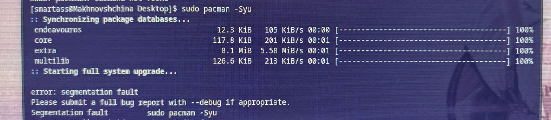 That said, before I re-logged I attempted to run “sudo pacman - Syu” and got a segmentation fault.
