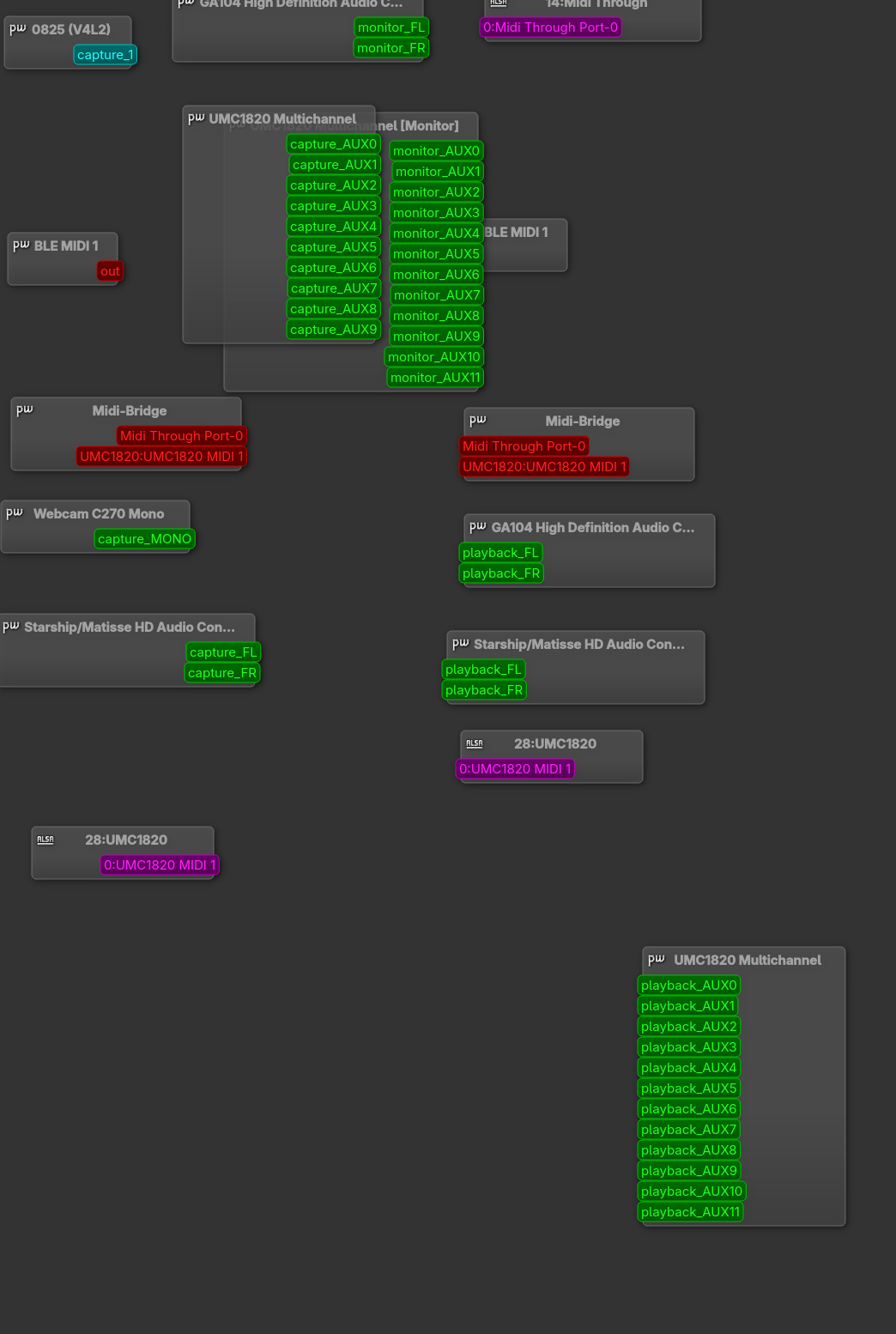 Interface Channel Mapping: As seen in your qpwgraph screenshot, your interface lists channels as playback_AUX0, AUX1, etc. Some games get confused by this “Multi-channel” layout and fail to find a “Front Left/Right” pair to output to.