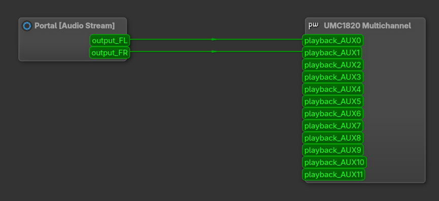 Restart PipeWire again. You will now see a new output device called GameStereo in your system sound settings. Set this as your Default Output, then use qpwgraph to manually route the GameStereo monitor to your interface’s AUX1 and AUX2.
