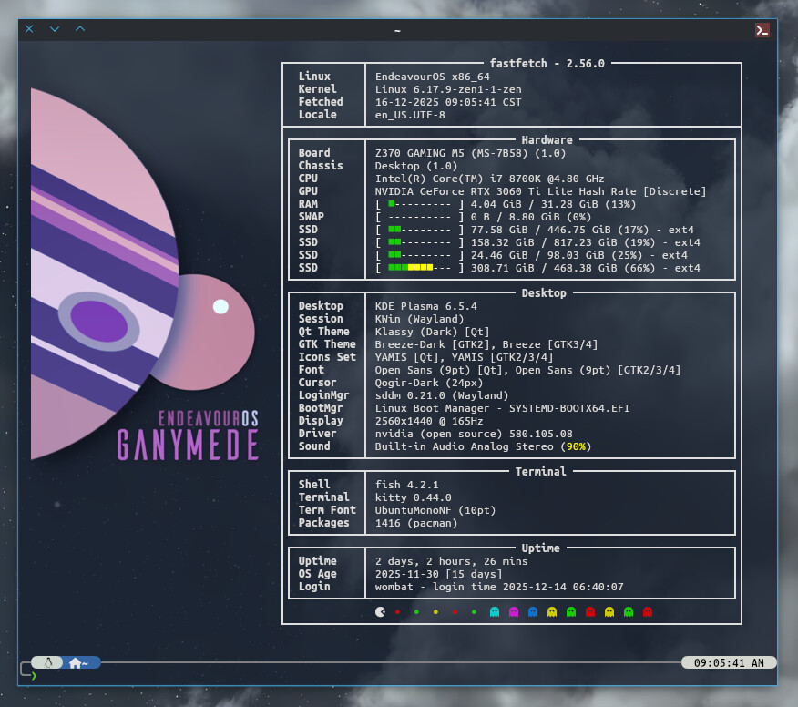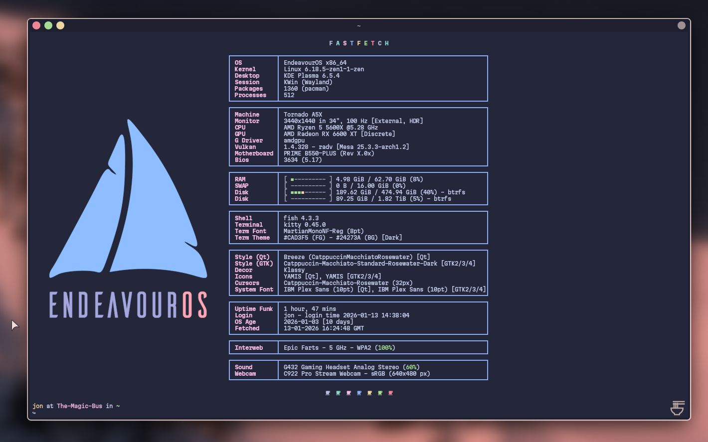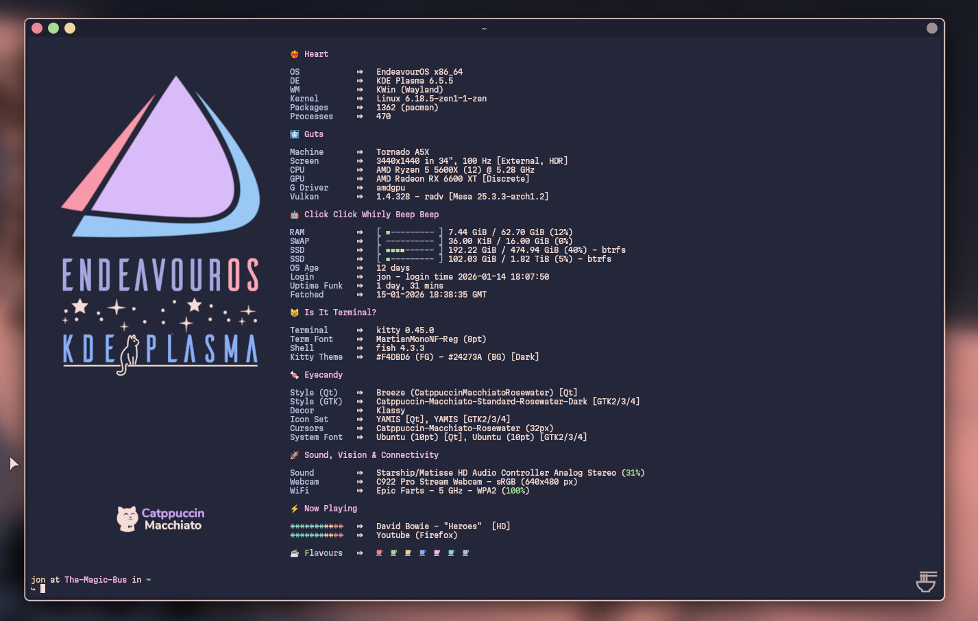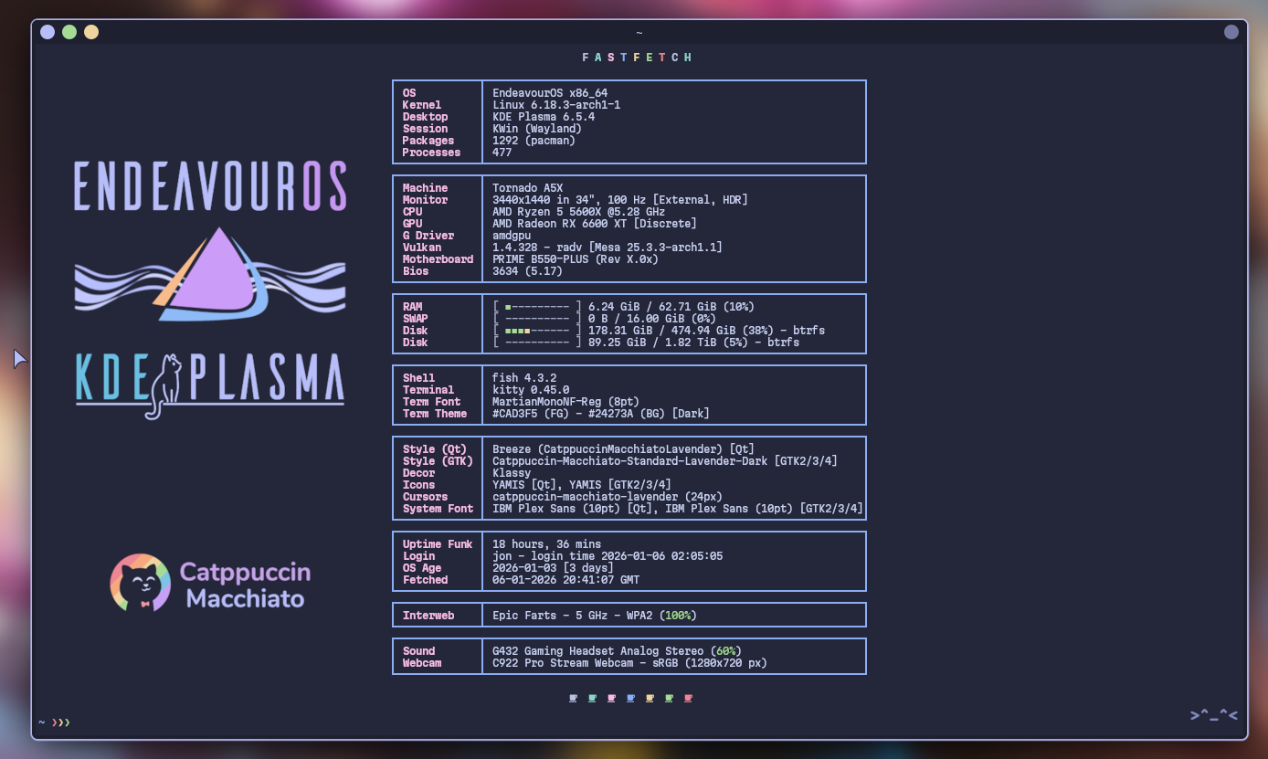 These are stunning, I’ve been locked in on Catppuccin Mocha variants for a while now, - they’re just such a gentle dark mode that works really well with the palette of colours it uses. I’ve managed to find themes for most of the main apps I use that cover it, so it’s just perfect. Absolutely LOVE that fastfetch logo!!! Nice work!