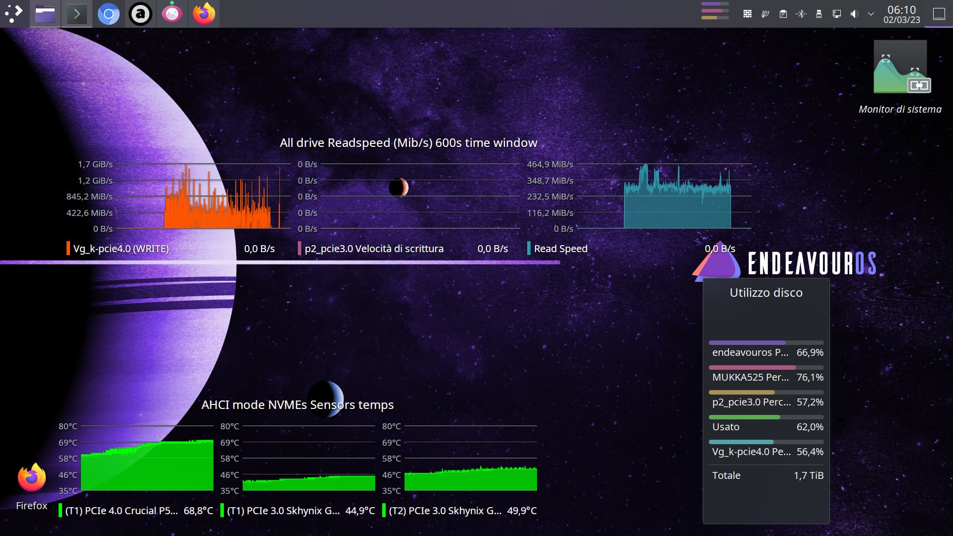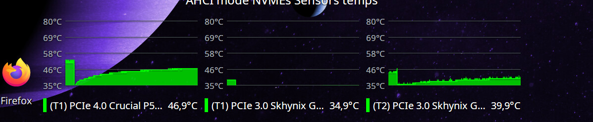 vmd, andnvmeitās work among at maximum performance allowed by the PCIe bus, the nvmeās ssd is pretty cold on standby or idle system temperature mark around 40 C°, will go higher under heavy I/O data transfers of course I get today 3Gbps transfer from PCIe 3 to PCIe 4 drive (it mean all 32Gbps bandwidth is allocated) and this is hopefully my goal to get on EnOS.