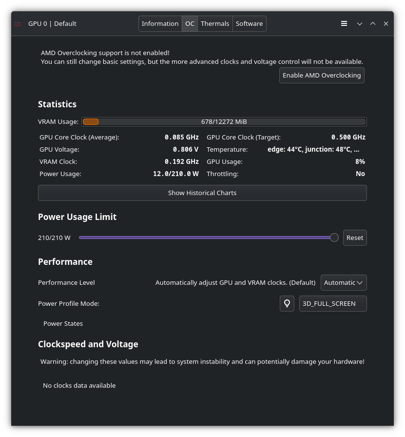 About two or three days back, I ran a system upgrade using yay (I don’t update as frequently as I should, but at least once in a given month), and as far as I’m aware, I then found I couldn’t play 7 Days to Die, as I wouldn’t get above 1FPS in the main menu or game, with my CPU maxing out, but my GPU just sitting idle. It wasn’t until I tried booting Palia and it refused to boot completely saying it required a GPU that was D3D11 compliant (EDIT: that specific error is “A D3D11-compatible GPU (Feature Level 11.0, Shader Model 5.0) is required to run the engine.”) that I put two and two together, and had a look at my system information in system settings, and found my graphics processor listed only as llvmpipe, with no mention of my discreet card, an RX 6750 XT, anywhere. My CPU is a little Ryzen 3 3100, so there’s no onboard graphics, just my AMD Card.