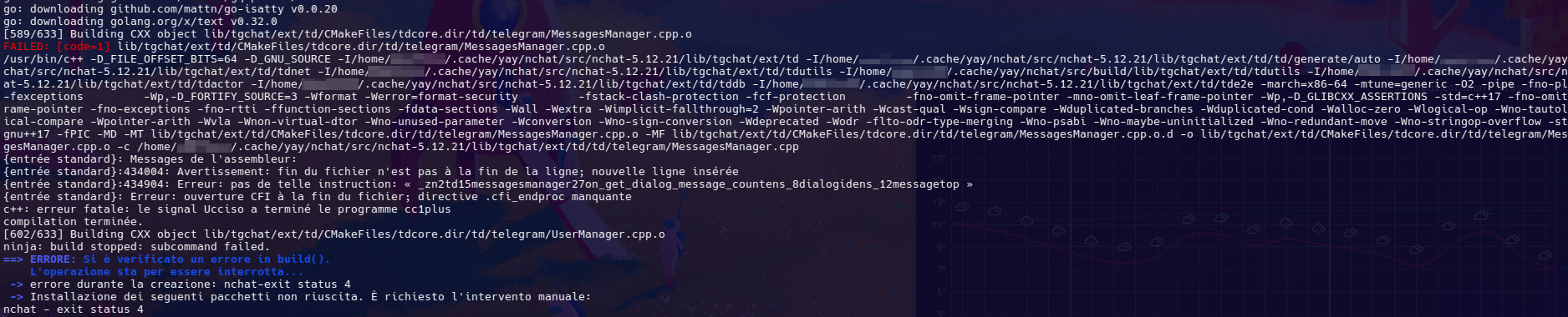 In a desperate try to overkill it, I set up a 16GB Swap file (bringing my total RAM to 32GB, “magically”), and this method finally allow the installation to finish. Even like this, I saw Swap file being used at more than 10%: this means that the simple yay -S nchat instruction took nearly 20GB to complete (we’re talking RAM) !