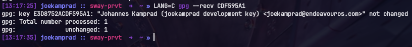 gpg: key E3D8752ACDF595A1: public key "Johannes Kamprad (joekamprad development key) <joekamprad@endeavouros.com>" imported