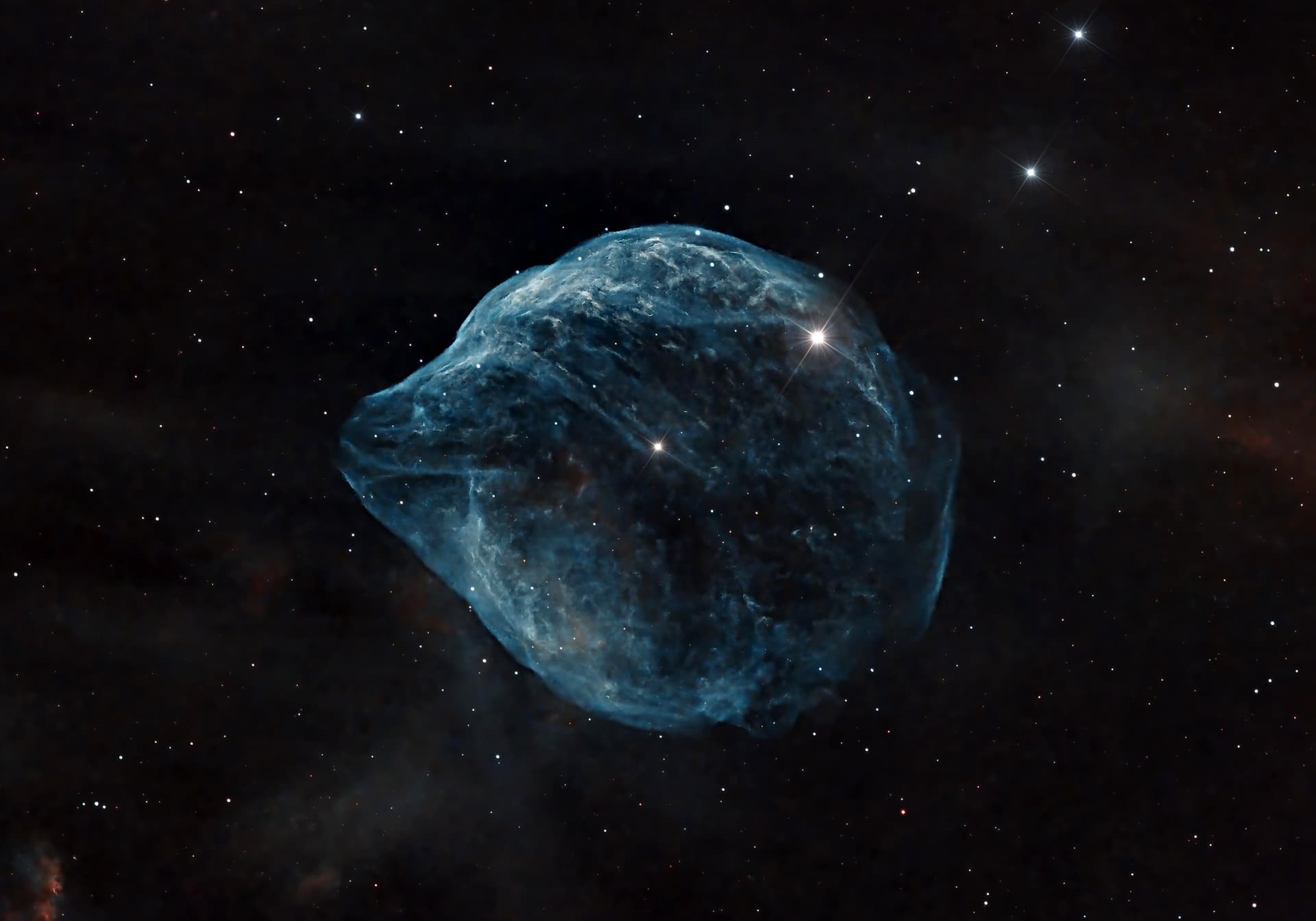 Image is of Dolphin-Head Nebula captured over three nights. The nebula is about 4,530 light-years away from Earth and is located near the center of the constellation Canis Major, composed of ionised hydrogen. This star is in the brief, pre-supernova phase of its stellar evolution.