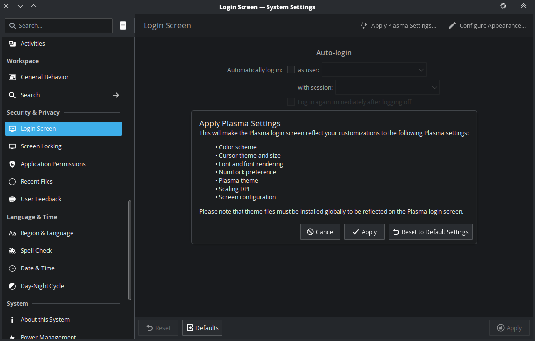 For customisation we intend to expose the same familiar settings that exist in Plasma and bring the design more in-line with the existing screenlocker where we also dropped arbitrary QML years ago. We’ll make the wallpaper configurable with any existing wallpaper plugins, and expose the existing plasma theme and colour settings. Syncing will be a case of copying files, not re-inventing things.