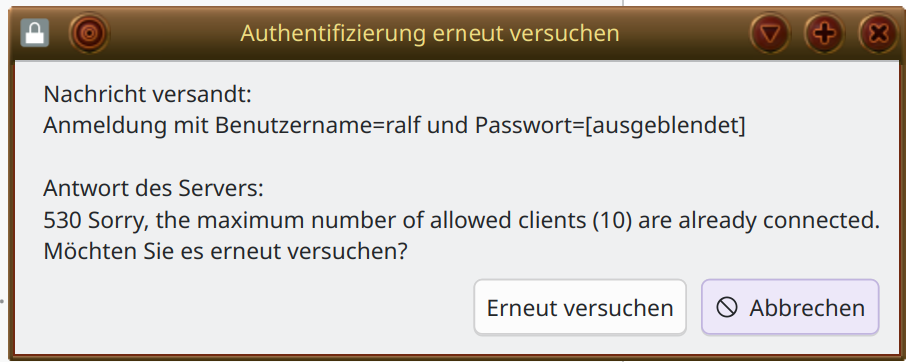 OpenMediaVault bringt standardmäßig einen FTP-Server mit Verbindungs-Limits mit. Wenn mehrere Verbindungen gleichzeitig offen sind (z. B. durch Dolphin, Wiederverbindungen, abgebrochene Transfers oder parallele Tabs), ist dieses Limit schnell erreicht. Dann kommt genau diese Meldung.