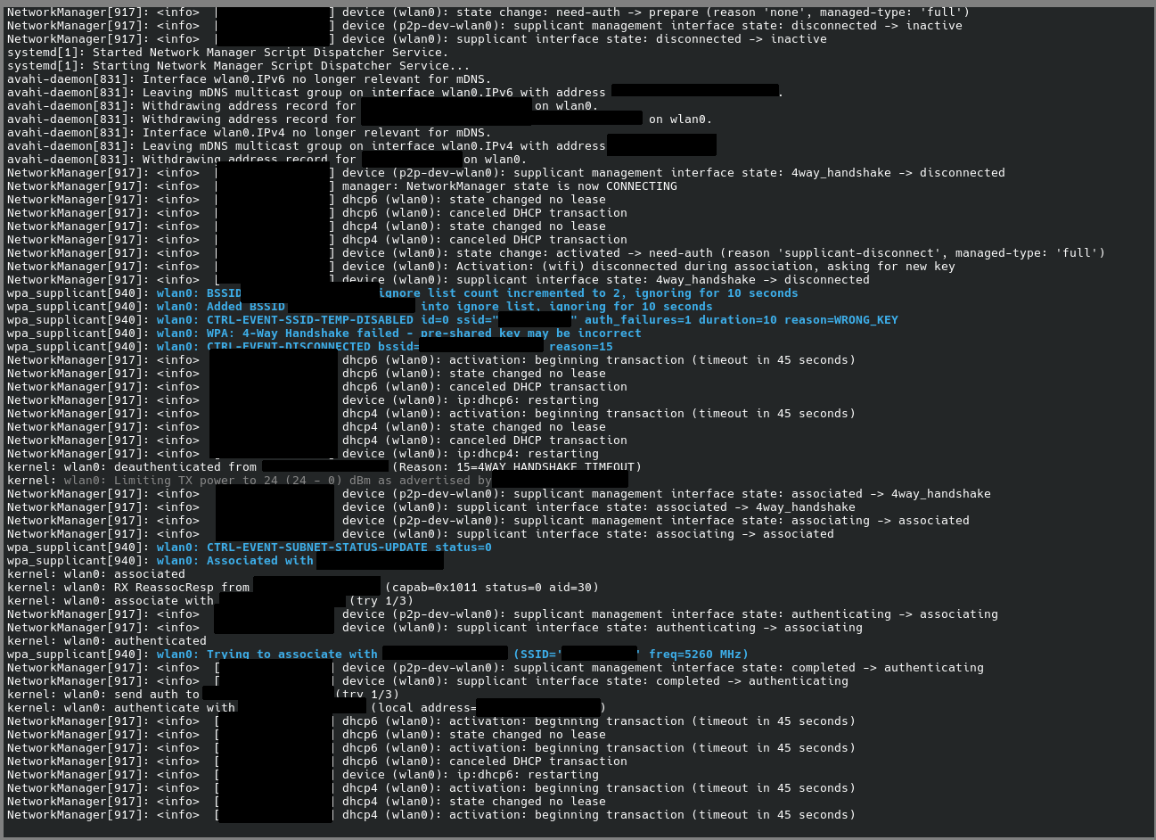 I did figure out journalctl -r and -f, and running those when the error happens. I’m not smart enough to know what any of this means, and I’m playing it extremely safe with covering up stuff that might be sensitive info.