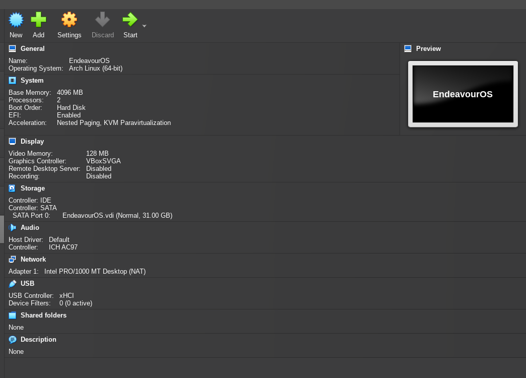 I got EndeavourOS (new VB installation) fixed by changing the Display Setting to VBoxSVGA, even though Virtualbox indicates “Invalid Settings Detected”.