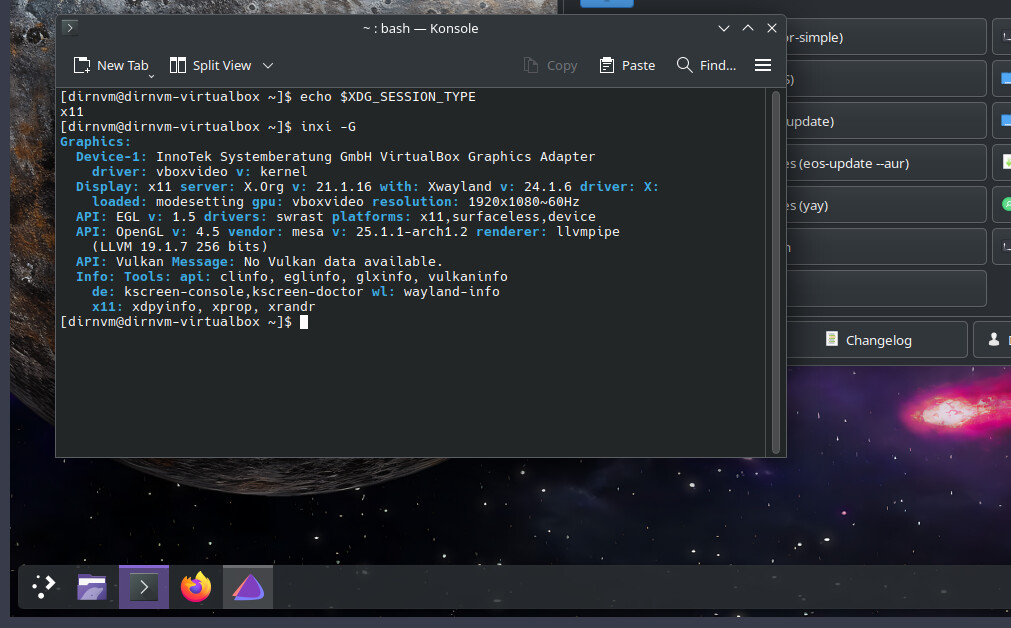 X: loaded: modesetting alternate: fbdev,vboxvideo,vesa gpu: vboxvideo