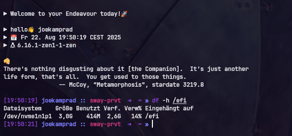 This Endeavour OS installation is about a year old on a new Laptop. I used the EOS Installer and the disk was fully partitioned as the installer suggested; the filesystem is BtrFS. I followed the instructions of the installer.