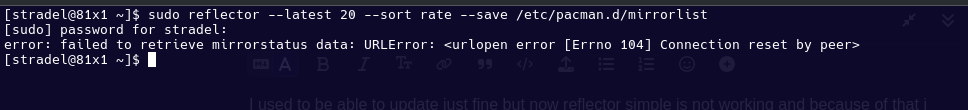 I used to be able to update just fine but now reflector simple is not working and because of that i can not update the mirror list for it or update its packages.