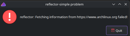 Ranking mirrors with reflector (or refelctor-simple), however, may fail, as they retrieve the latest mirrorlist at archlinux.org/mirrors/status/. If that website is down or times out, reflector will fail.