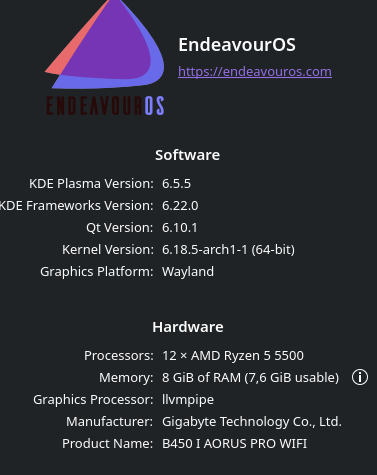 v: 6.22.0 wm: kwin_wayland vt: 1 dm: SDDM Distro: EndeavourOS