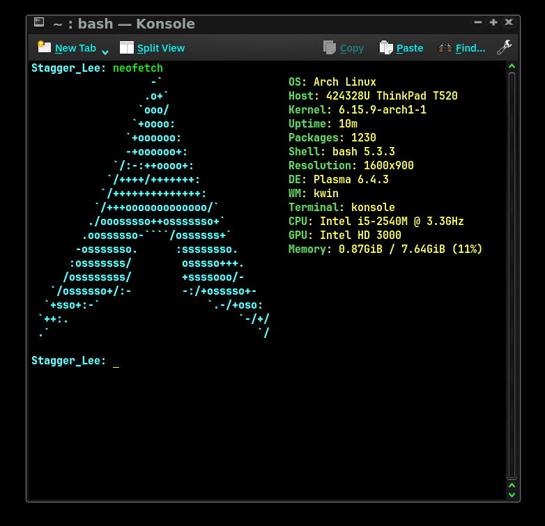 Salvation Army buy for $49, this 2011 Lenovo T520 came with 16g memory and at least had the drive sled inside it. I tossed in a Samsung 500g ssd I’d gotten from another old machine (nice score) and installed Kubuntu originally. But EndeavourOS is my go to, and once I saw how really snappy this old warhorse was, I had to do it. It has a dual core i5 2.6g second gen cpu. But as long as gaming isn’t the plan this thing flies.
