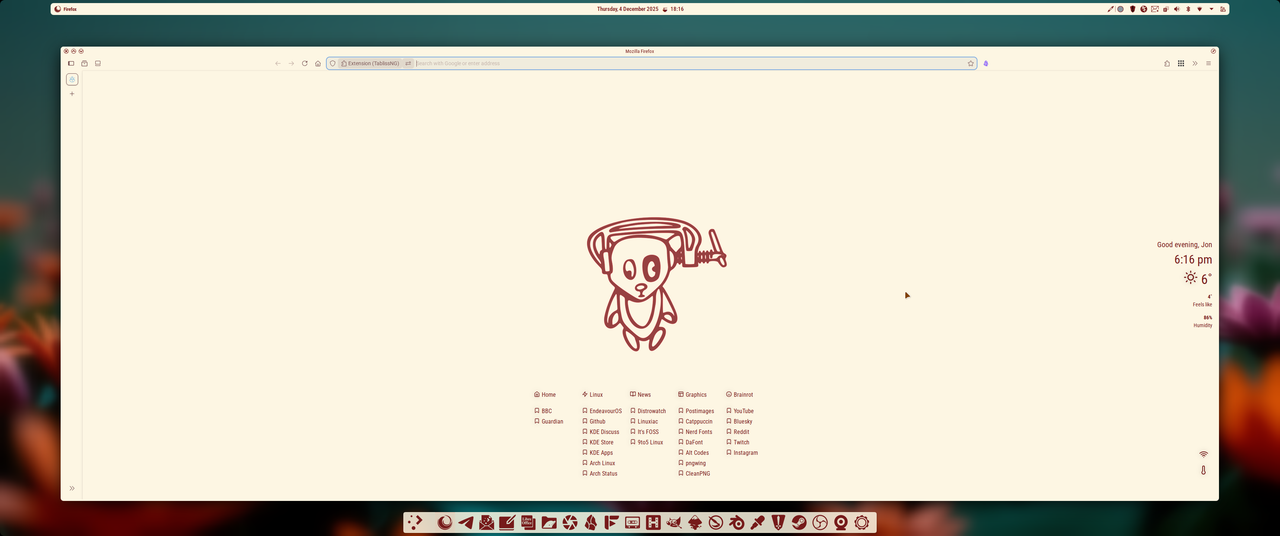 Firefox new tab is TablissNG, a fully maintained fork of the original Tabliss (which hasn’t been maintained for a year).